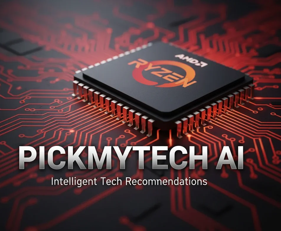 Ryzen processor chip on motherboard with PickMyTech AI branding. Official PickMyTech AI image featuring AMD Ryzen processor for smart tech guidance.